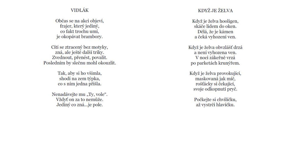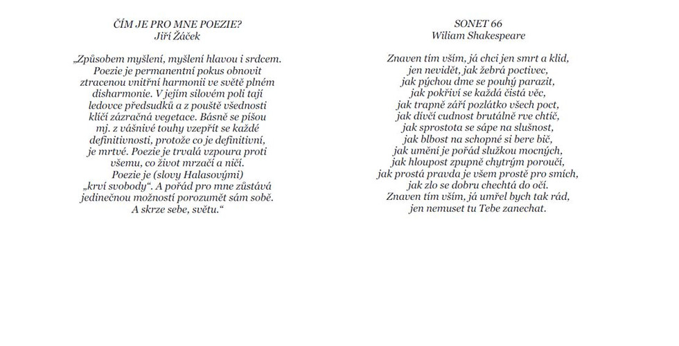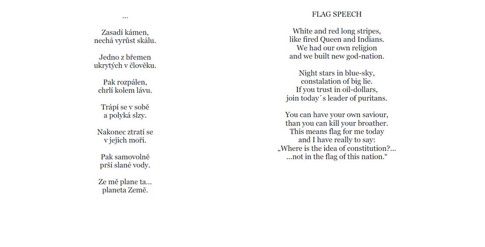 I like poetry and playing with words as Aphorisms, Greguerías or good quotes. I sended few brend new words (ANOkalypsa) to Čeština 2.0. I translated also poem by Mohammed bin Rashid Al Maktoum "Affection in Your Eyes" to Czech language. Between my favourite poets are the ones from Moravia too like Karel Kryl, Karel Plíhal or Jarek Nohavica and I also enjoy Slam poetry. I published two collections at my own expense - 4/5 sonets (2005) and Free Citizens Best of Blog: Quotes (2016).
